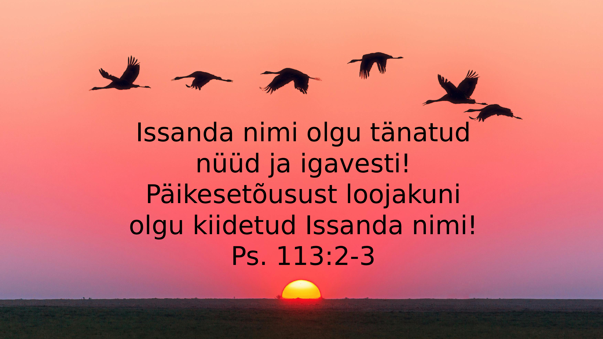 Kuidas alustame ja lõpetame oma päeva? Psalmisti sõnade kohaselt tuleb seda teha Issandat kiites – päiksesetõusust loojakuni olgu kiidetud Issanda nimi. Kahtlemata peab laulik siin silmas ka seda, et kogu maa peaks kiitma Issandat, sest „päikesetõusust loojakuni” on ikka tähendanud ka ruumilist mõõdet. Jumal on hea, Tema paneb tähele ja kannab hoolt ka nende eest, kes ühiskonnas on kõrvale jäetud. Muidugi oleks õige, kui tõesti kogu maal kõik kiidaks Issandat ning oleks hoolivad ja toetavad üksteise suhtes. Kahjuks on Jumal pidanud ikka ja jälle oma rahvale meelde tuletama, et nad ei ole elanud nii, nagu see oleks õige ja Jumalale meelepärane. Kuid alati on võimalus meelt parandada ja teha õigeid armastuse tegusid. Olgem Jumala rahvana meie need, kes kiidavad ikka Issandat ja armastavad ligimest nagu iseennast.