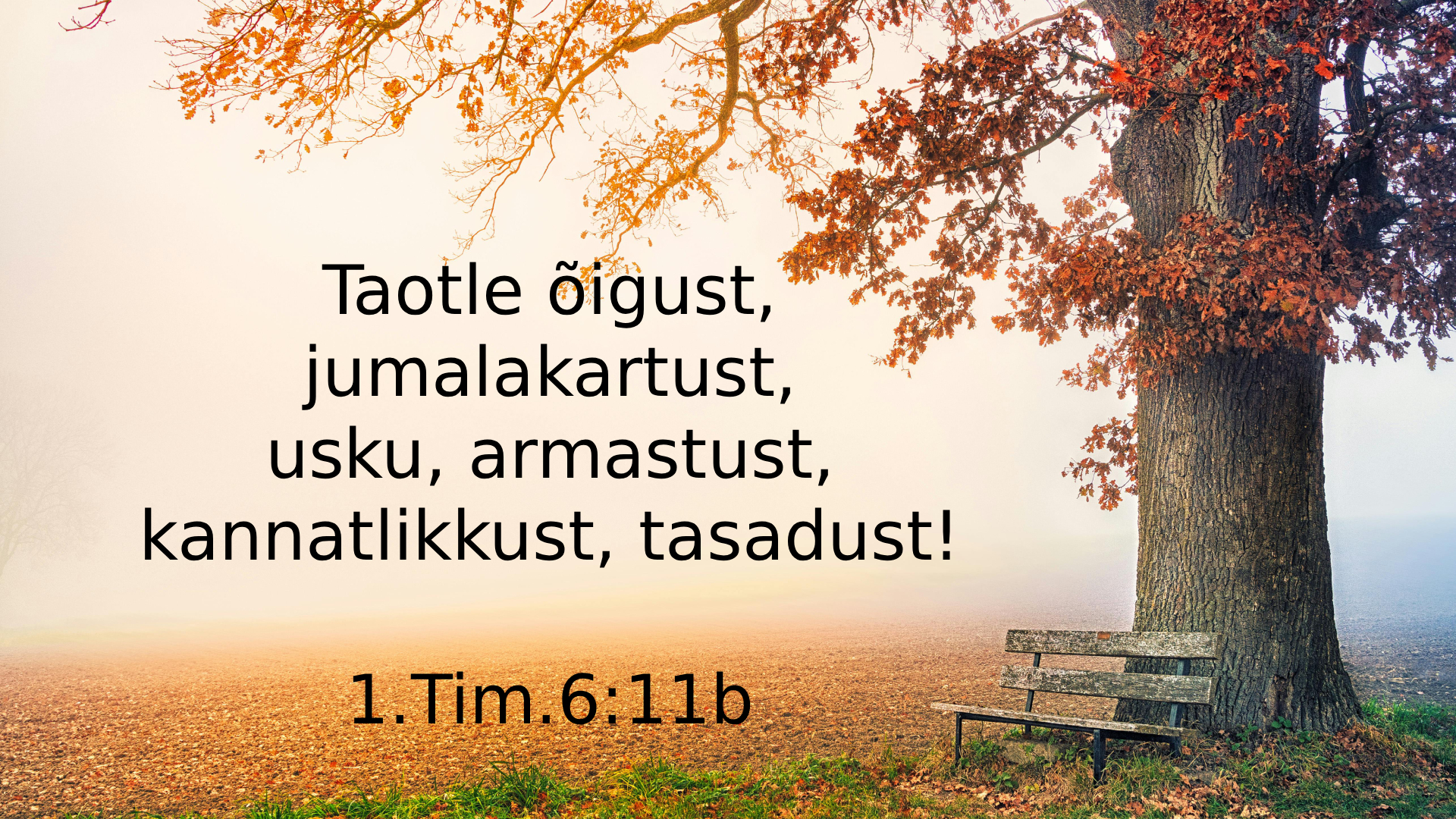 Sina aga, Jumala inimene, põgene selle eest! Taotle õigust, jumalakartust, usku, armastust, kannatlikkust, tasadust! Võitle head usuvõitlust, hakka kinni igavesest elust, millele sa oled kutsutud, kui sa oled andnud hea tunnistuse paljude tunnistajate ees. Ma käsin sind Jumala ees, kes teeb kõik elavaks, ja Kristuse Jeesuse ees, kes Pontius Pilaatuse ees andis hea tunnistuse, et sa käsku säilitaksid puhtalt ja laitmatult meie Issanda Jeesuse Kristuse ilmumiseni, mille parajal ajal toob nähtavale õnnis ja ainus võimas valitseja, kuningate Kuningas ja isandate Issand, kellel ainsana on surematus, kes elab ligipääsmatus valguses, keda ükski inimene pole näinud ega suudagi näha. Tema päralt olgu au ja igavene võimus! Aamen.