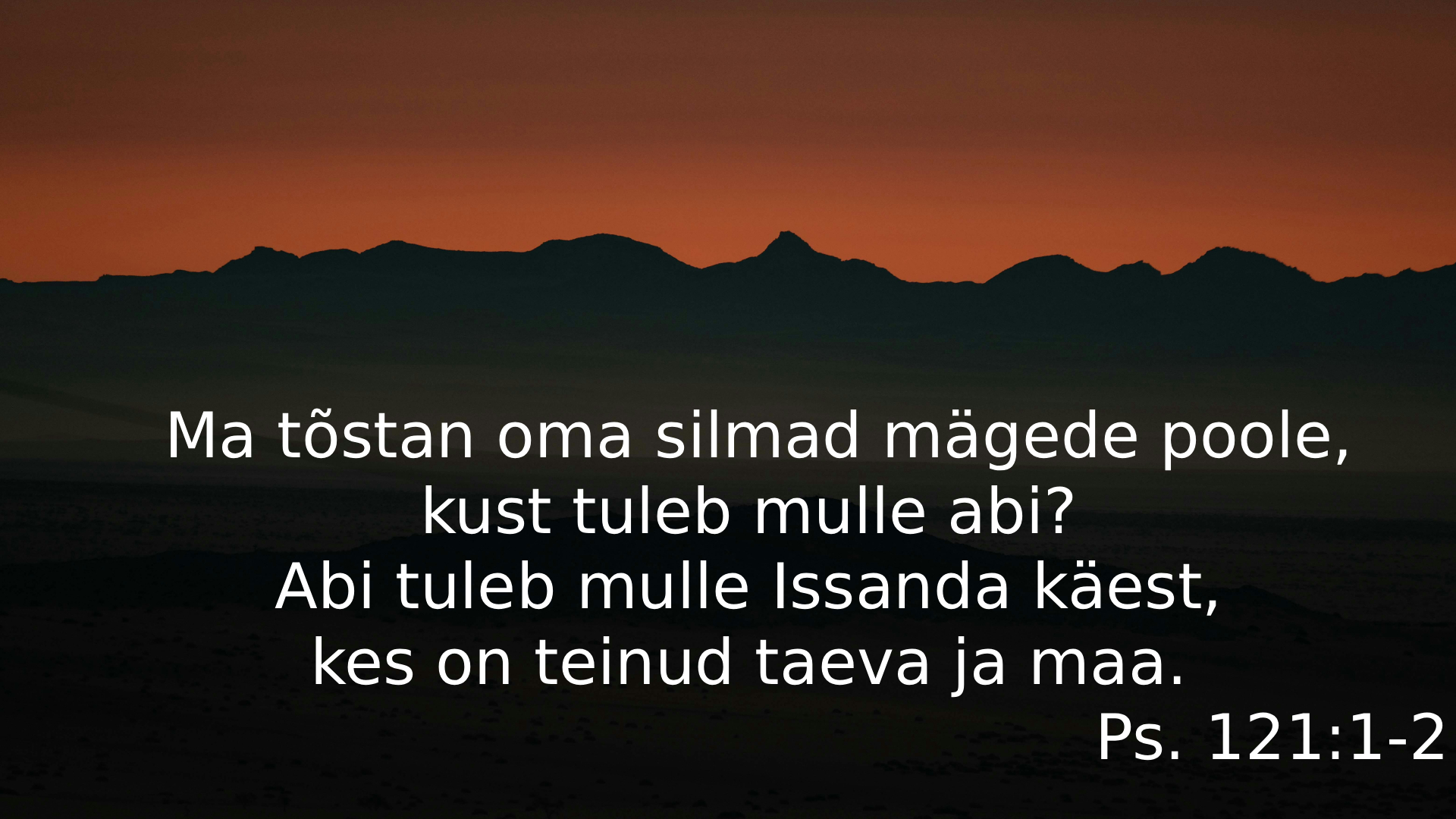 Palveteekonna laul. Ma tõstan oma silmad mägede poole, kust tuleb mulle abi? Abi tuleb mulle Issanda käest, kes on teinud taeva ja maa. Ei ta lase su jalga vääratada, ei su hoidja tuku. Vaata, ei tuku ega jää magama see, kes Iisraeli hoiab. Issand on su hoidja, Issand on su varjaja su paremal käel. Päeval ei pista sind päike ega kuu öösel. Issand hoiab sind kõige kurja eest, tema hoiab sinu hinge. Issand hoiab su minemist ja su tulemist nüüd ja igavesti.