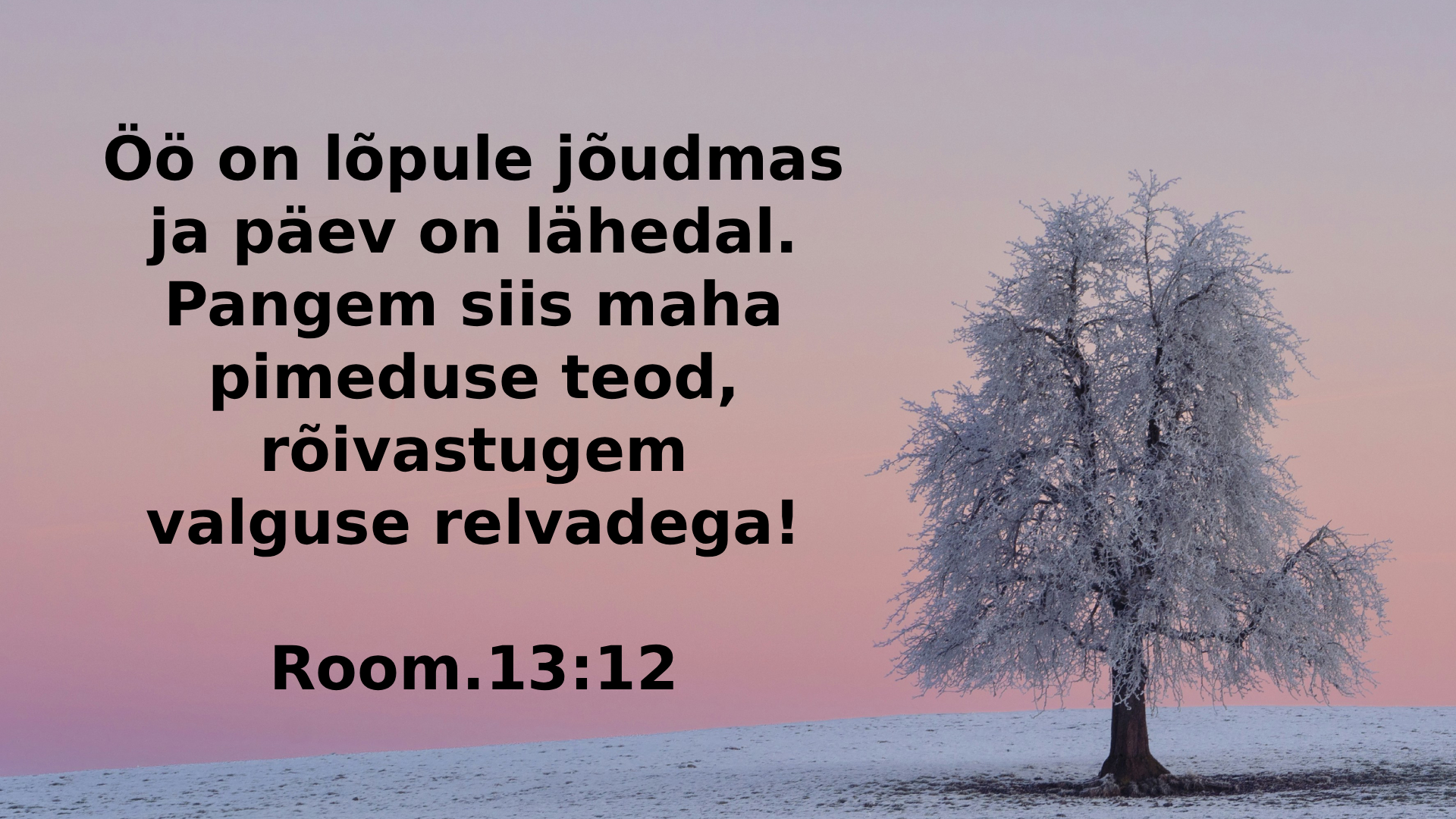 Kui Ristija Johannes sündis, siis tema isa Sakarias prohvetlikus ettekuulutuses ütles, et Jumala halastuse läbi on tulnud meid katsuma päevatõus kõrgest. Johannese evangeeliumi 1:9 on kirjas: „Tõeline valgus, mis valgustab iga inimest, oli maailma tulemas.” Nii Sakarias kui evangelist Johannes pidasid silmas Jeesuse sündi siia maailma inimesena. Oleme astunud advendiaega – Kristuse tuleku ootuse aega. Advendiajal meenutame Jeesuse sündi sajandeid tagasi, kuid mõtleme ka Jeesuse taastulekule aegade lõpul. Jeesus Kristus ongi see tõeline maailma tulnud valgus. Valgusel on omadus tuua esile see, mis on vajalik muuta või korda teha. Kui tuba on pime, ei näe me kõikjale kogunevat tolmu. Kui aga tuba on valge, torkab kohe silma, kust on vaja tolm ära pühkida. Apostel Paulus kirjutas roomlastele: päev on tulemas, valgus on saabumas. Temagi peab silmas Kristuse tulekut, aga mitte enam sündi, vaid taastulekut kohtumõistja ja kuningana. Ning selleks tuleb valmistuda. Pauluse soovitus on, et tehke oma elu korda – pange maha need asjad, mis kristlasele ei sobi ja elage nii nagu Jeesus on õpetanud. Pauluse soovitused on väga aktuaalsed ka täna. Jõulud ja aastavahetus on aasta kõige sündmusterohkemad ajad. Kõikvõimalikku meelelahutust erinevates vormides on sel ajal nii palju, et jätkub kõigile rohkem kui vaja. Kahjuks suur osa on just „prassimine ja purjutamine”. Riidu ja kadedust näeme tänagi enda ümber liiga palju. Ihu eest tuleb ikka hoolt kanda, see on vajalik ja loomulik. Kuid seegi võib muutuda himude rahuldamiseks ja röövida liigselt meie tähelepanu, aega ja raha. Elades Kristuse ootuses, püüdkem elada Kristusele meelepäraselt, tehes head ja armastades kõiki. Nagu Tema ise on meile öelnud: „Teie olge siis täiuslikud, nõnda nagu teie taevane Isa on täiuslik!”